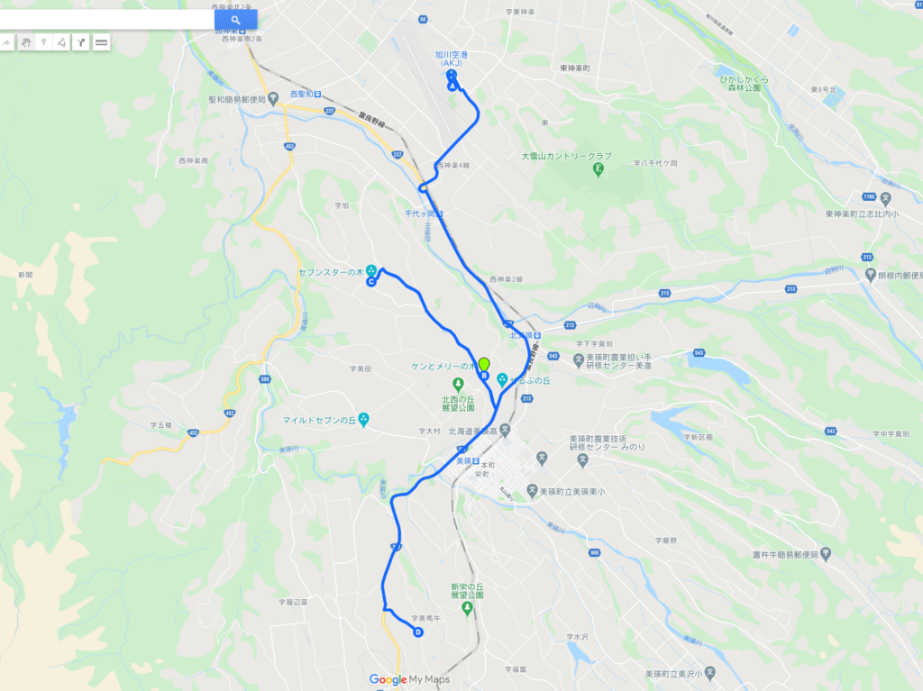 旭川空港からのドライブルートです。それぞれの場所は地図で想像するより距離があるので、時間配分は気をつけてくださいね。