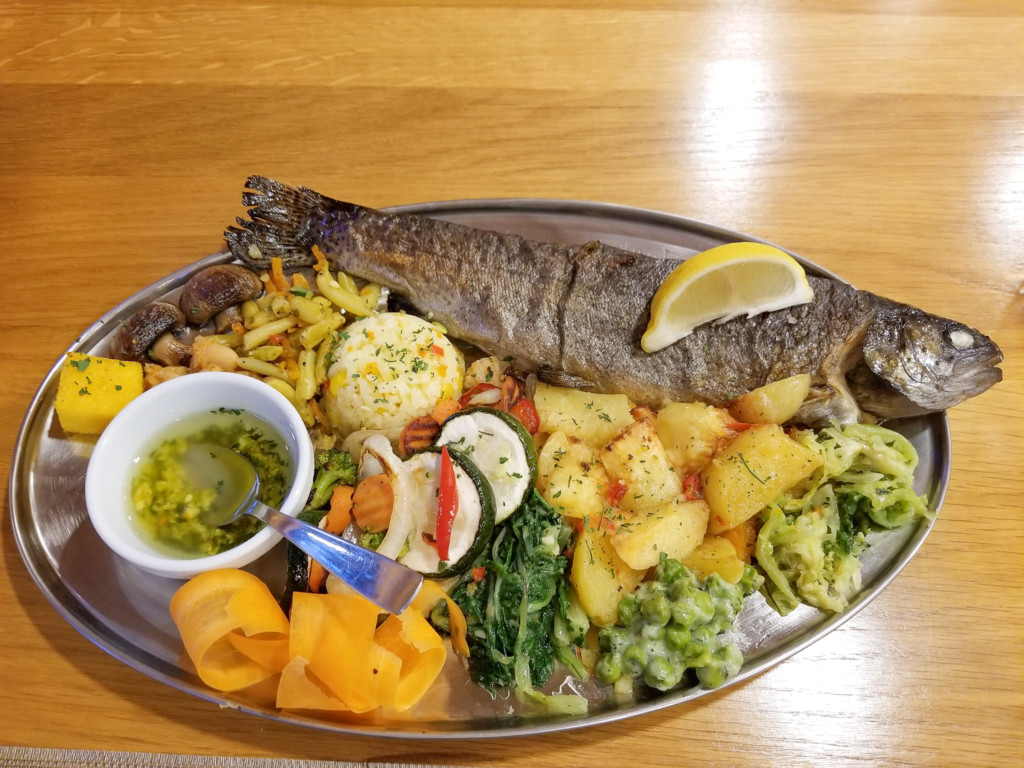 ディナーでいただいた、湖で獲れたマスのグリルが美味しかった~! でもお魚はサイドディッシュでメインが野菜みたいでしょ?ジャガイモがホクホクして、他の野菜も新鮮で甘くてとっても美味!